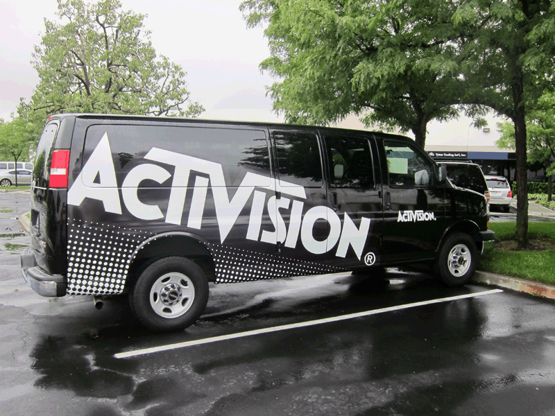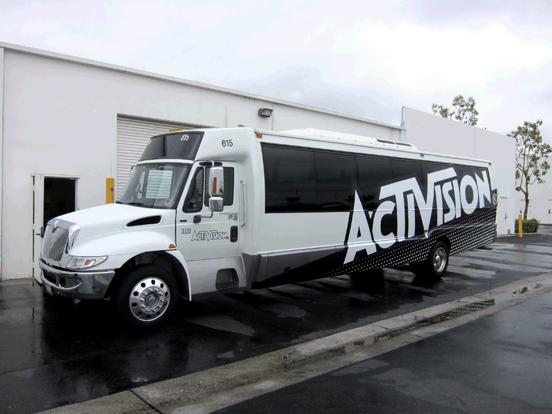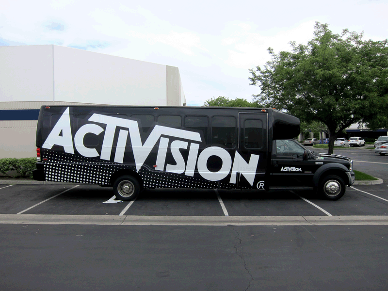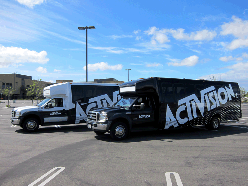 The graphics on these shuttle buses for Activision, which do not completely cover the vehicle, are considered a partial wrap. A partial wrap is a great alternative to the full wrap. A properly designed and installed partial vehicle wrap can have the same impact as a full vehicle wrap, at a fraction of the cost. Read more about partial wraps here.