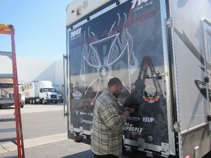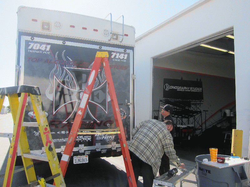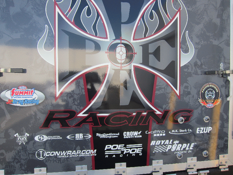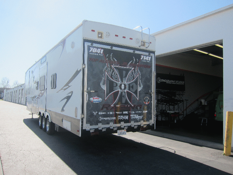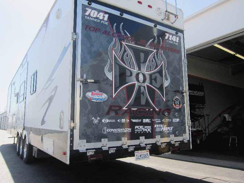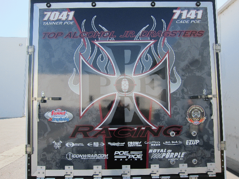 The vehicle wrap experts at Iconography are proud to have created, produced and installed these custom graphics on the Poe & Poe Racing Trailer.