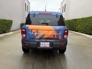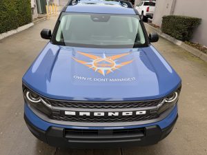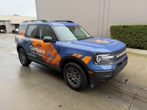 The Ford Bronco offers a unique canvas for a Custom Car Wrap. Iconography is proud to have designed, printed, and installed this custom graphic wrap for Compass Property Management. This project not only exemplifies the artistry involved in custom wraps but also showcases the potential to transform an ordinary vehicle into a mobile advertisement that captures attention and generates interest.