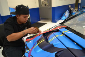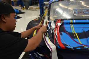 Applying our custom livery wraps involves a meticulous process ensuring every detail aligns with the team’s vision.