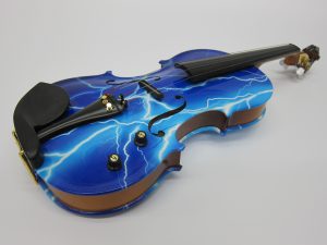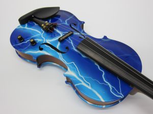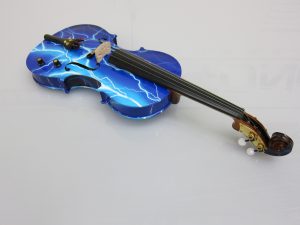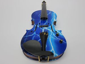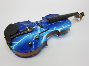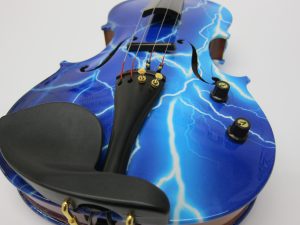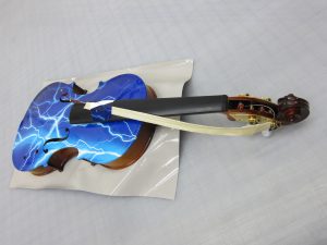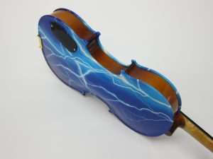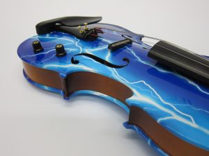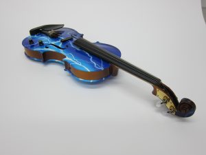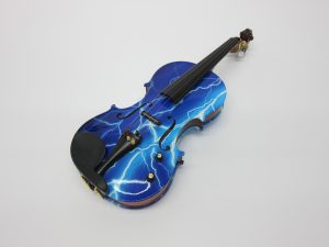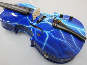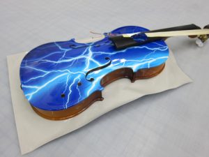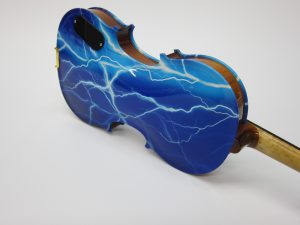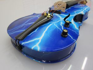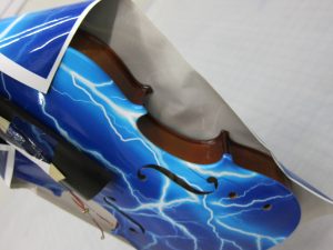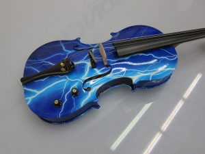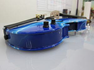 Violin wrap by Iconography Studios. We are proud to have produced this stunning electric blue wrap on a Violin which made it’s debut at the NAMM Show in Anaheim, CA. The team at Iconography Studios is no stranger to difficult instrument wraps, including pianos, drums, synthesizers and even accordions, so they were up for the challenge of attempting this violin wrap.